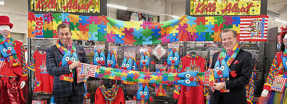 Christoph Kuckelkorn stellte den neuen Mottoschal heute gemeinsam mit Deiters-Inhaber Herbert Geiss im Frechener Hauptsitz des Kostümherstellers vor. „Deiters fühlt sich eng mit dem Kölner Karneval verbunden und sieht es daher als Selbstverständlichkeit, auch in schweren Zeiten beieinander zu stehen und sich zu unterstützen. Wir freuen uns, über den Verkauf des Mottoschals den karnevalistischen Nachwuchs zu fördern, damit der Fastelovend in dieser Stadt auch in Zukunft so bunt und vielfältig bleibt wie er heute ist“, so Herbert Geiss. „Der Karneval ist ja auch nicht abgesagt, sondern es finden nur weniger Veranstaltungen statt. Mit dem riesigen Dom auf dem Schal kann jeder Kölner unser Wahrzeichen an jedem Tag dieser sehr besonderen Session ganz nah am Herzen tragen.”