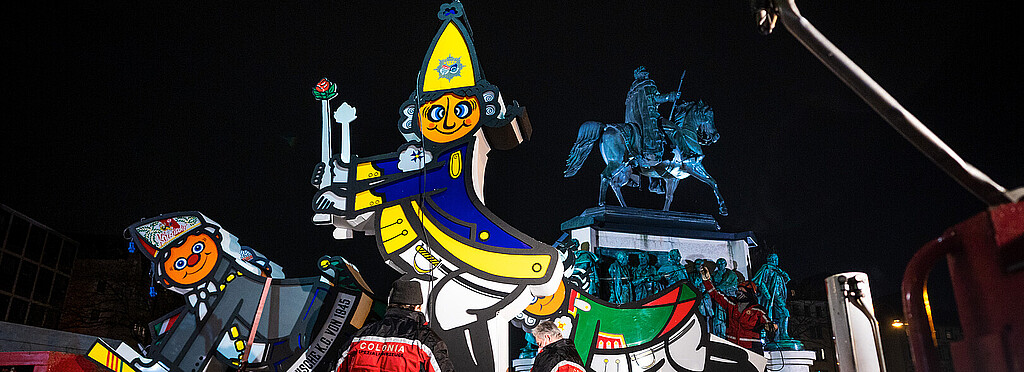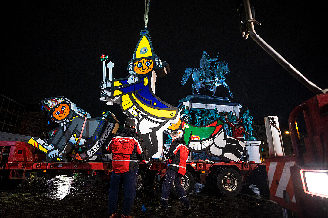 • Festkomitee stellt karnevalistische Leuchtfiguren in Köln auf