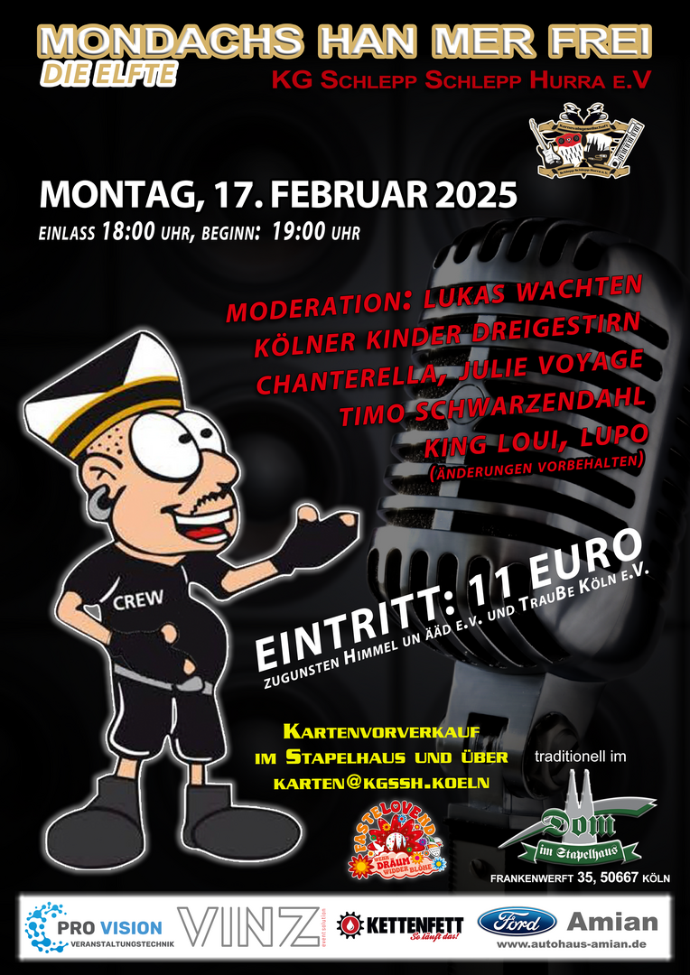 Der Einlass beginnt um 18:00 Uhr und um 19:00 Uhr beginnt das Programm. Wie immer geht der gesamte Erlös an „Himmel un Ääd“ und an „TrauBE Köln“.