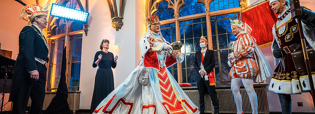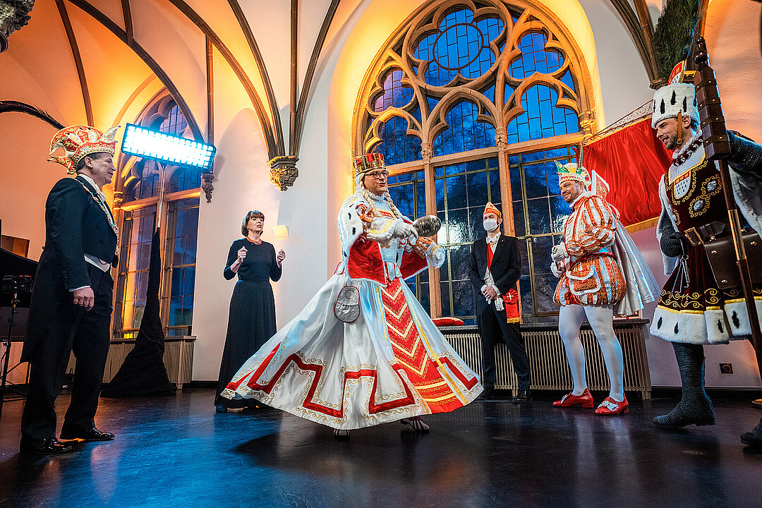 Das designierte Kölner Dreigestirn wird im großen Saal des Gürzenich vom Kölner Stadtoberhaupt offiziell ins Amt gehoben und regiert ab diesem Zeitpunkt über die Jecken der Stadt. Erstmals präsentieren sich Prinz, Bauer und Jungfrau der Session in ihrem maßgeschneiderten Ornat der Öffentlichkeit.